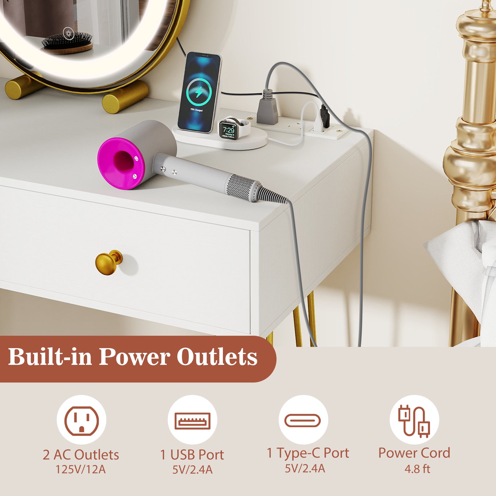 Independent Vanity Mirror with Lights: The included vanity mirror features 3 color modes—6500K cool white, 4500K warm white, and 3000K warm yellow—plus 20%-100% adjustable brightness to create perfect lighting for any beauty routine. Besides, its 360° free rotation offers your ideal angles.Built-in Power Outlets: The integrated charging station keeps all your devices powered with 2 AC outlets, a USB port, and a Type-C port, allowing you to charge your phone, tablet, or styling tools easily while you get ready.
