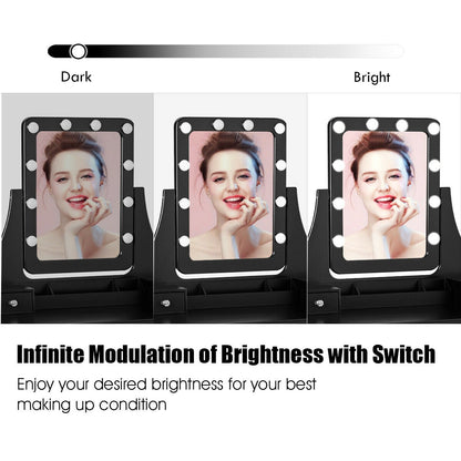 360° Rotatable Mirror with 10 LED Lights: Equipped with 10 LED bulbs, you can adjust the brightness infinitely according to different scenarios. The angle of the rotatable mirror can also be changed at will for the best makeup effect. Sitting in front of the mirror, you will feel like a movie star.
