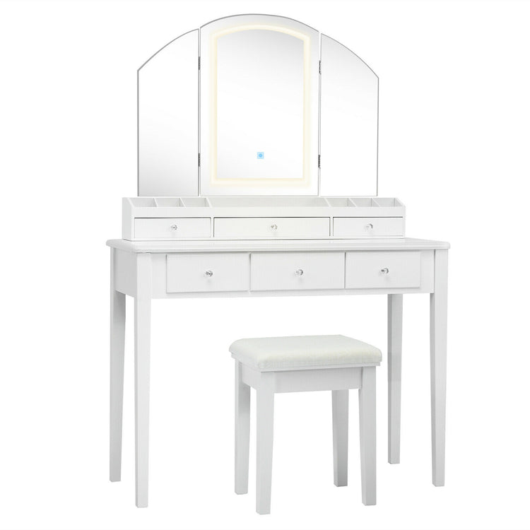 Vanity Table Stool Set with Large Tri-folding Lighted Mirror, White