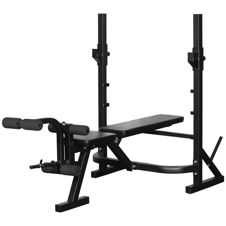 - Multipurpose training bench with leg curling, weightlifting bench, barbell rack, and weight disc holders