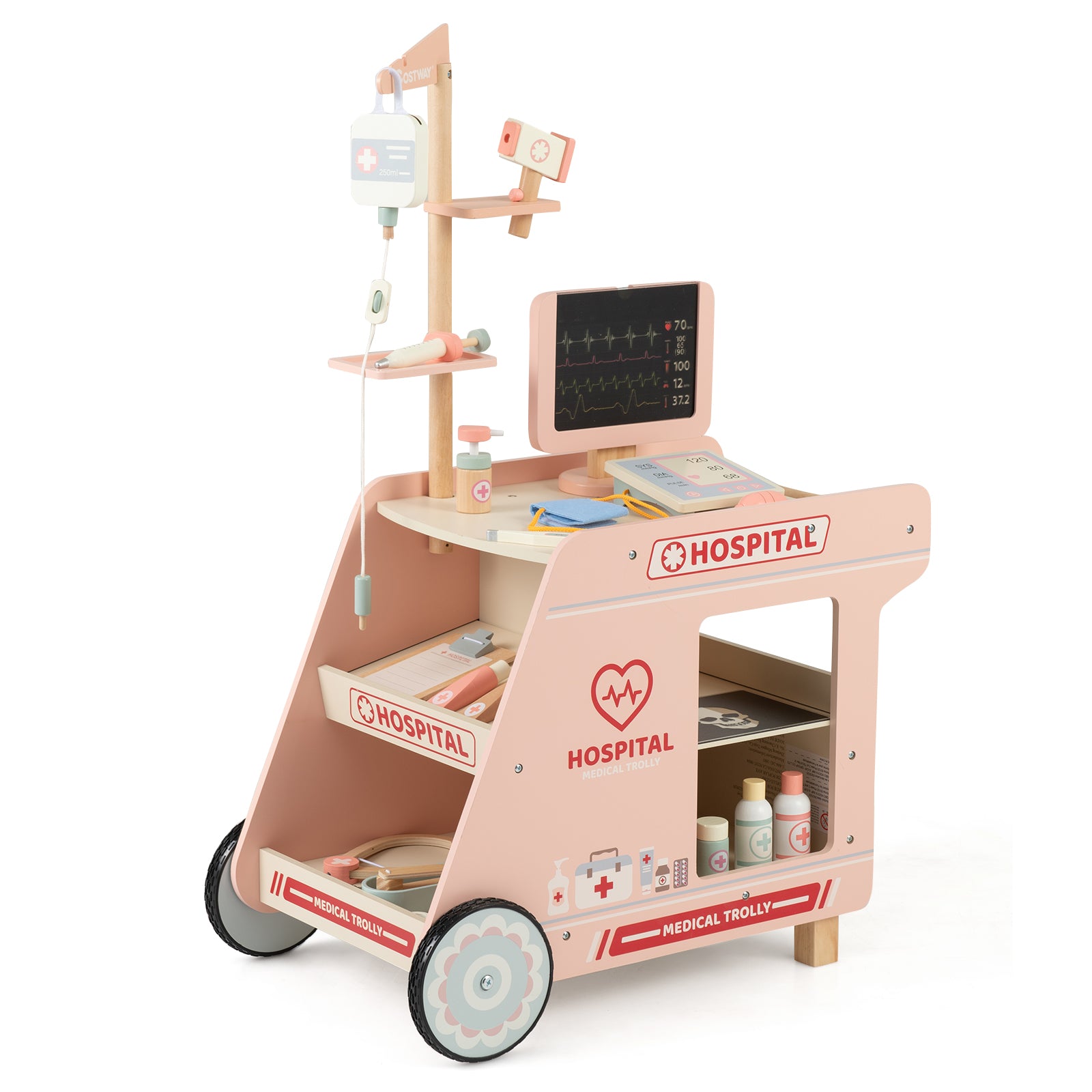 Wooden Doctor Playset for Kids Pretend Play Doctor Kit with Cart Gift for Toddlers Boys Girls Aged 3+, Pink
