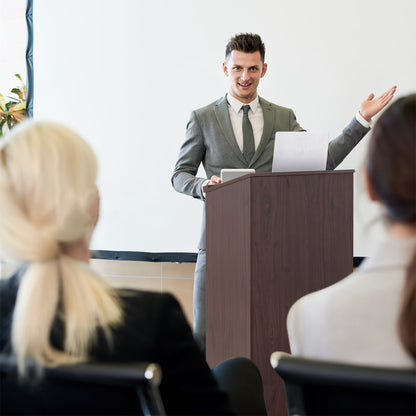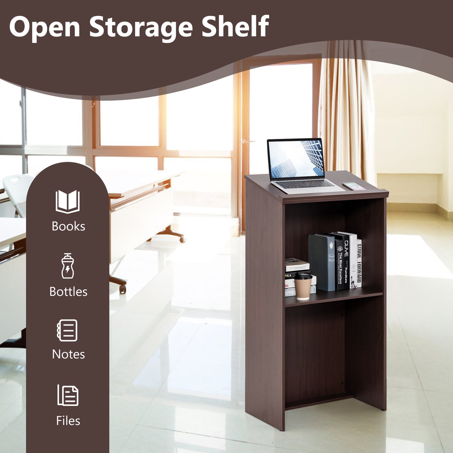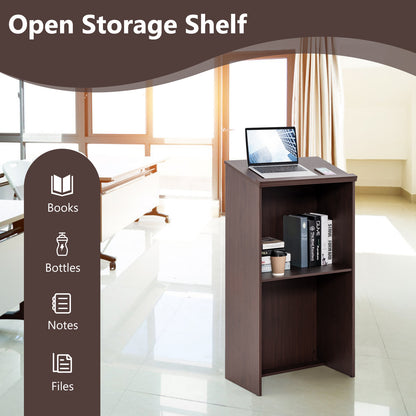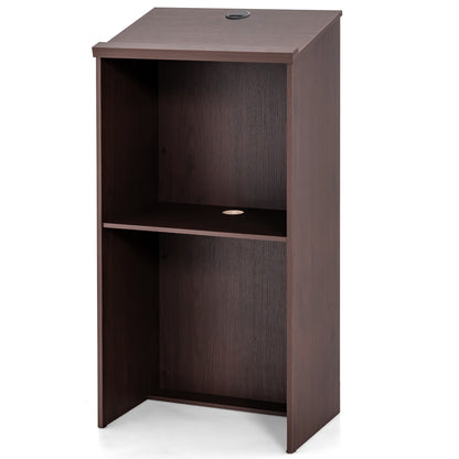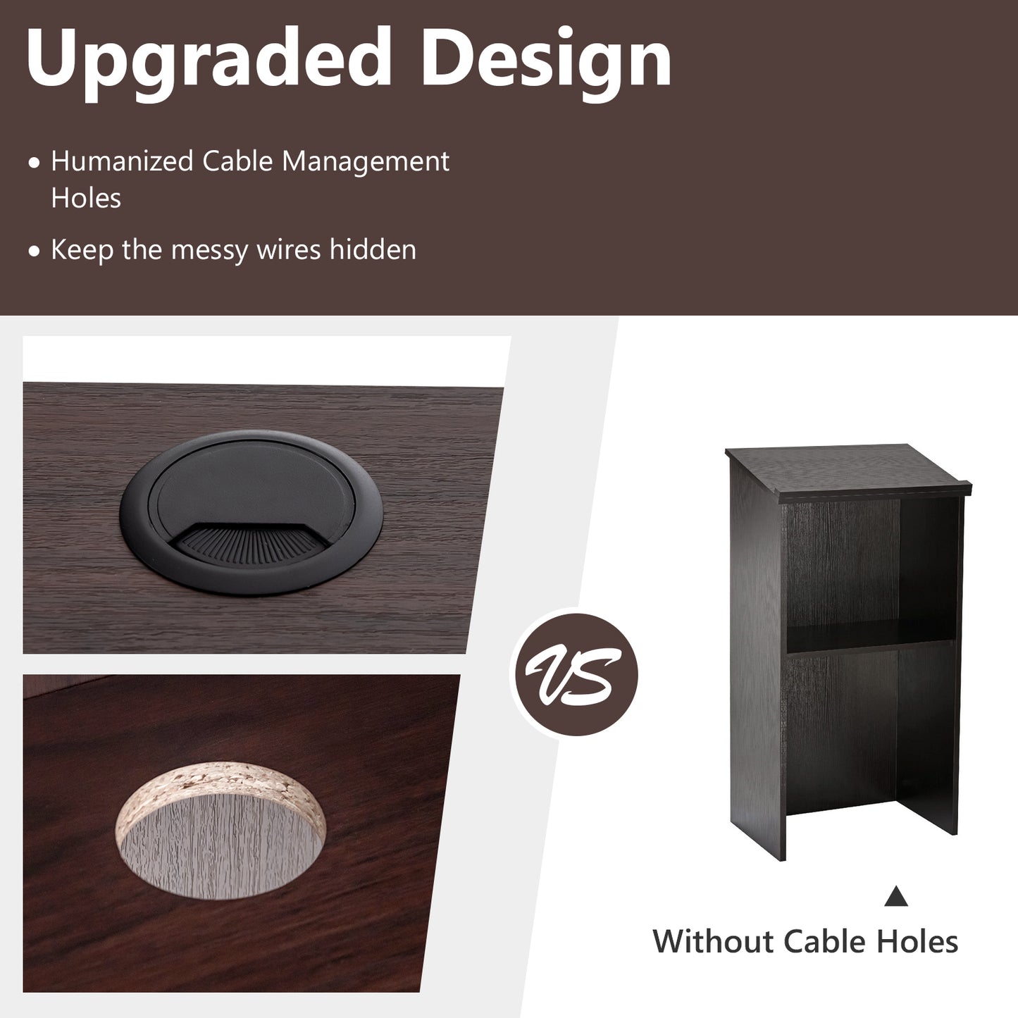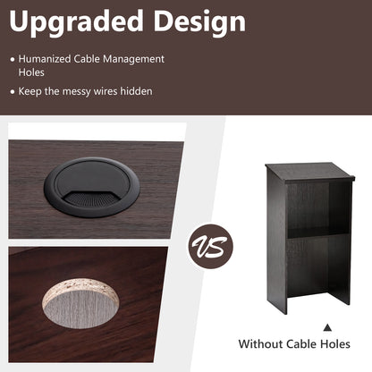 Enhance your presentations with this 46-inch podium stand featuring a slanted desktop, adjustable storage shelf, and cable management. Its sturdy engineered wood construction supports up to 66 lbs, making it ideal for classrooms, offices, and conferences.
