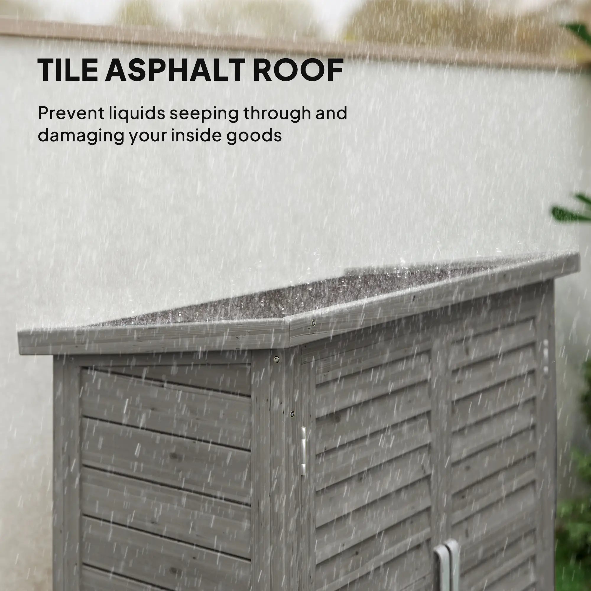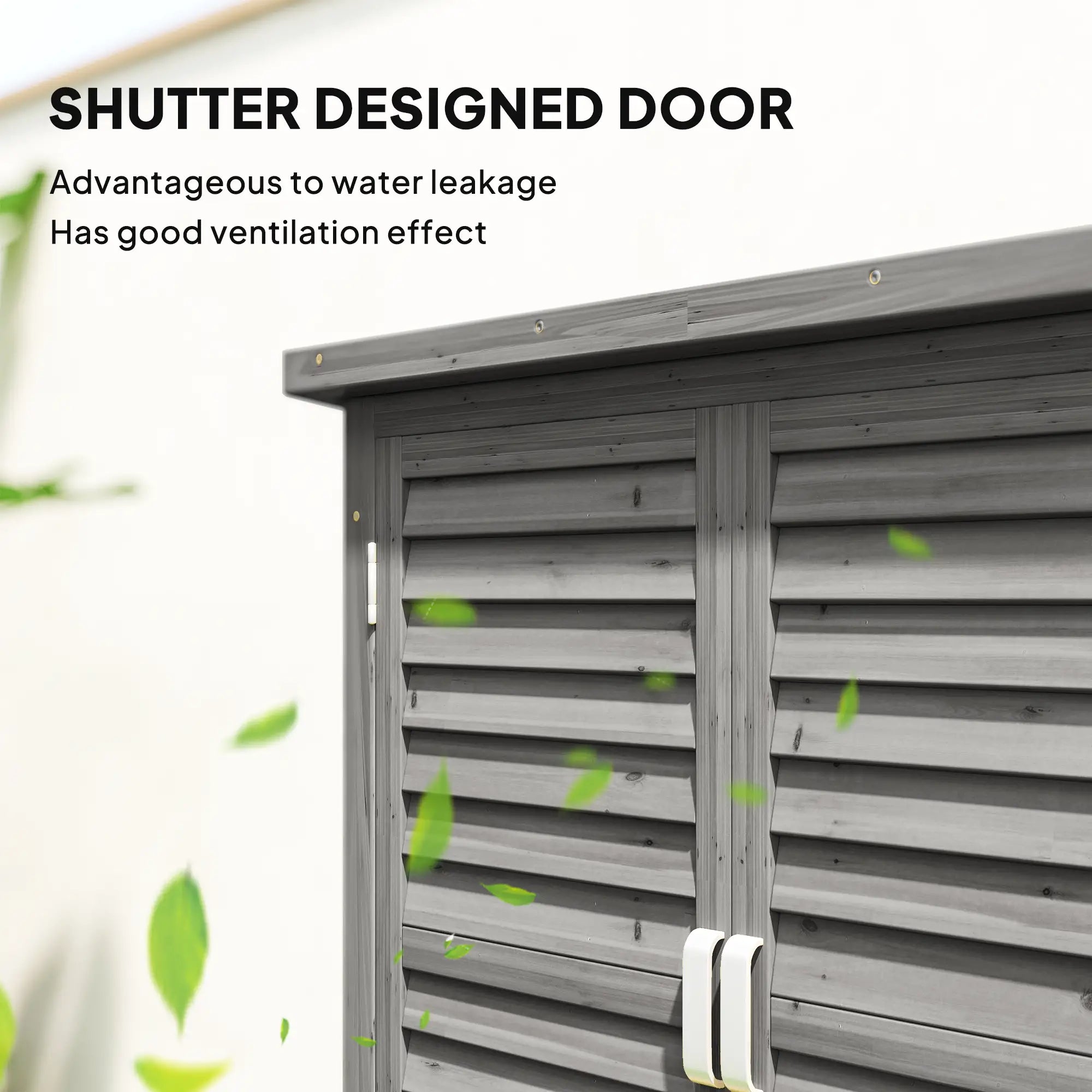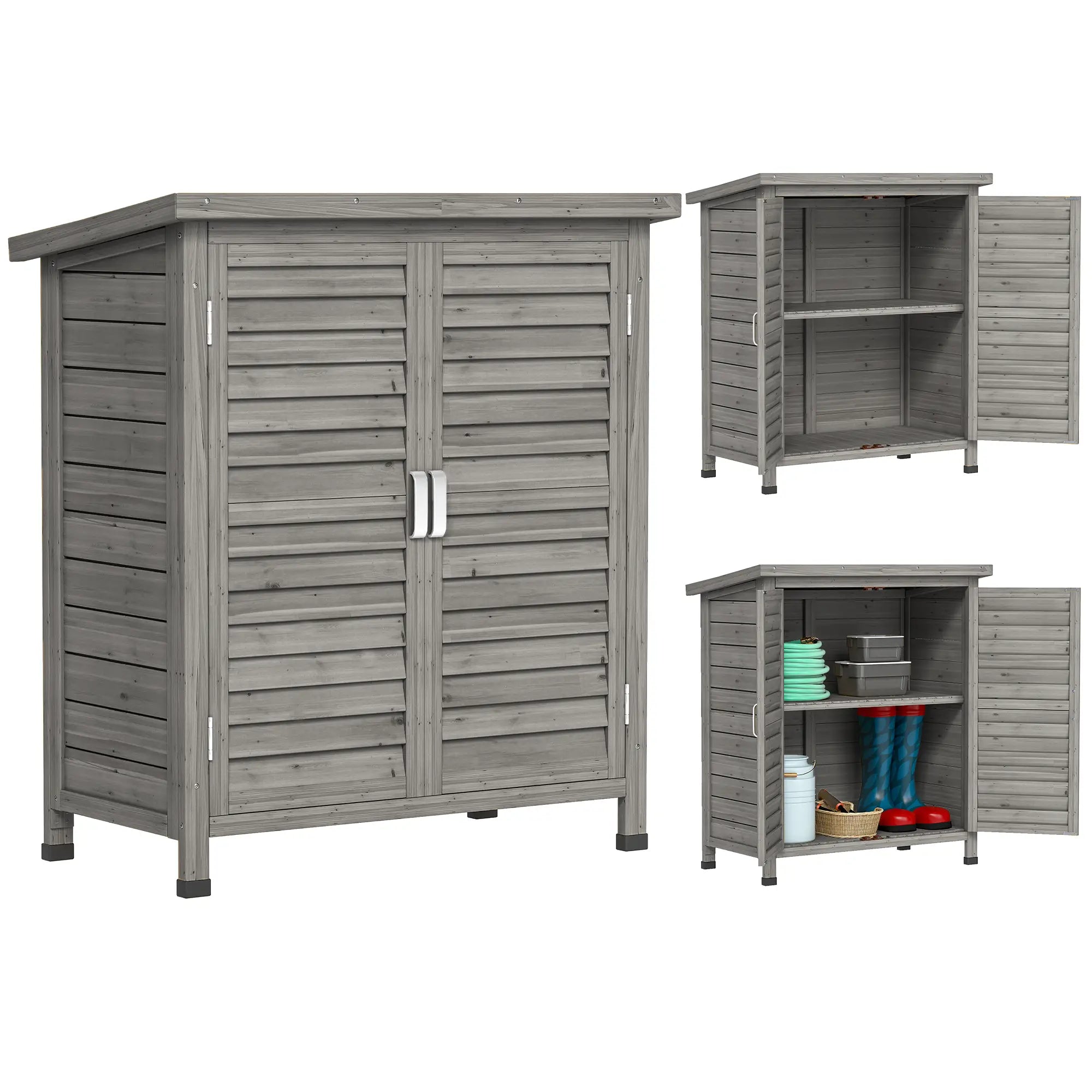 Organize your garden essentials with this durable fir wood garden shed, featuring a water-resistant top coat, two spacious shelves, and shutter-style doors for ventilation. Its tilted roof prevents water buildup, ensuring long-lasting use.